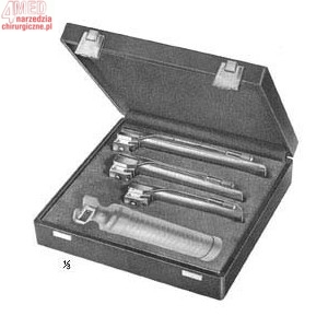 Zestaw laryngoskopowy GUEDEL NEGUS (zimne światło):1 łyżka 90mm, 1 łyżka 110mm, łyżka 135mm, rekojeść na baterie (30mm), etui